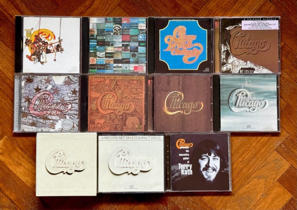 My Chicago CD Collection (above image). I love their elaborate “Chicago” themed album cover variations – silver bar (II), American flag (III), wood (V), leather (VII), chocolate (X), etc.